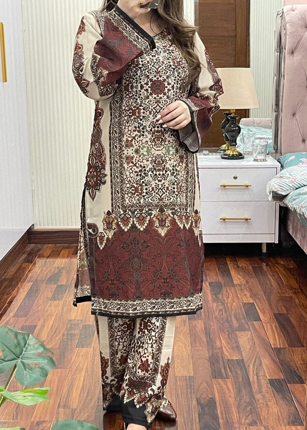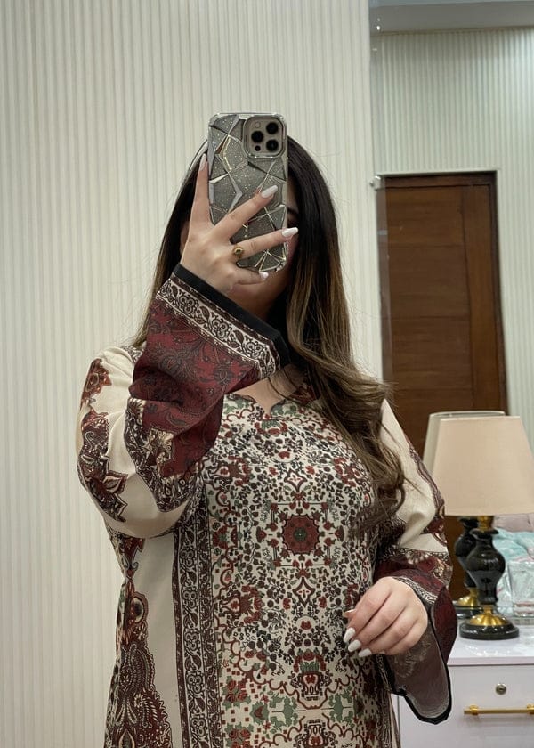 A timeless deep maroon 2-piece ensemble crafted in soft, breathable fabric, this outfit beautifully blends elegance with comfort. The kurta features intricate white embroidery along the neckline, sleeves, and borders, adding a graceful contrast to the rich maroon base. Straight trousers with matching embroidered edges complete the look, making it perfect for both casual gatherings and semi-formal occasions. Paired with delicate heels, this outfit exudes understated sophisticat
