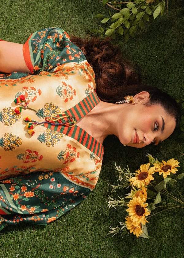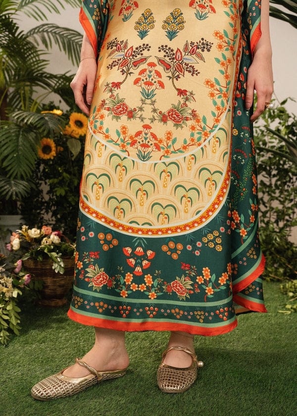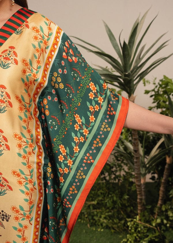 Elevate your winter style with this luxurious Shamooz Silk Kaftaan, a perfect blend of elegance and comfort. Crafted from premium shamooz fabric, this kaftaan features a smooth, glossy texture that drapes beautifully. The design showcases a vibrant mix of traditional and contemporary elements — intricate floral motifs in rich shades of mustard, red, and green adorn the front, while the deep emerald sleeves add a regal contrast.The V-neckline is accentuated with striped detailing and delicate tassels, adding a touch of sophistication. Its flowy silhouette ensures ease and grace, making it an ideal choice for festive gatherings, winter soirées, or cozy evening wear.