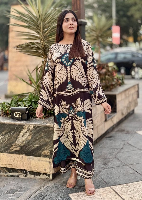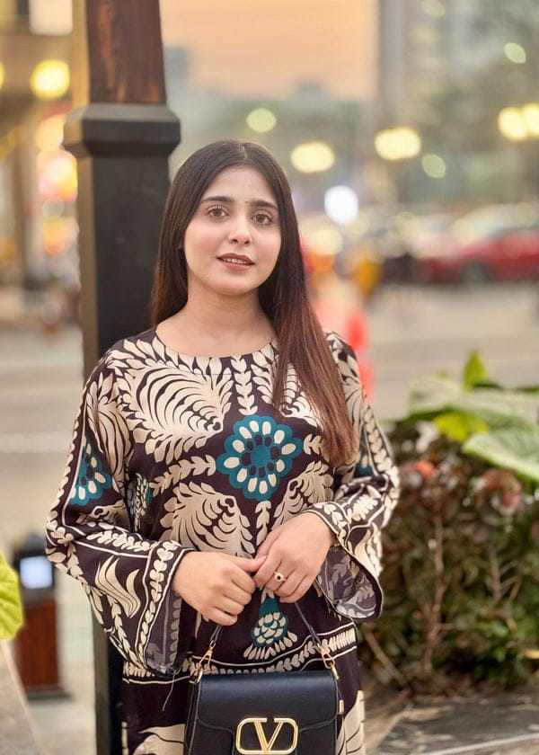 2-piece Co-Ord Set featuring a straight-cut slim-fit top and elegant plazzo trousers Made with luxurious charmuse/shamooz fabric for a silky, graceful fall Multi-color design with oversized botanical prints for a chic winter vibe No lining, giving it a soft, lightweight, natural drape